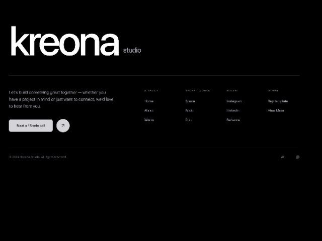 Full-width dark footer for a studio/agency featuring bold branding, contact CTA buttons, multi-column navigation and social links. Uses Tailwind-style utility classes, subtle animations, and responsive grid layout for modern website footers.