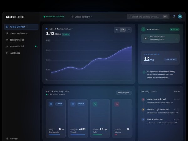 A full-width glassmorphism security operations dashboard with sidebar navigation, live status indicators, charts, KPI cards, search, and event logs. Built with Tailwind CSS for SOC, network monitoring, or admin analytics interfaces.