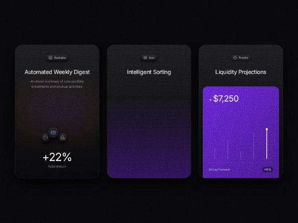 Three-column financial insights section featuring automated digest, intelligent physics-based sorting of expense tags using Matter.js, and liquidity forecast card. Uses Tailwind-style classes, iconify icons, and a WebGL noise overlay for a premium, interactive analytics layout.