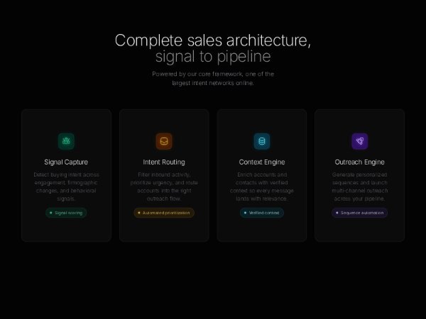 Dark-mode Tailwind CSS feature section showcasing a four-step sales pipeline with animated hover cards, icons, and layered detail panels. Ideal for SaaS, sales automation, RevOps, or product marketing landing pages.