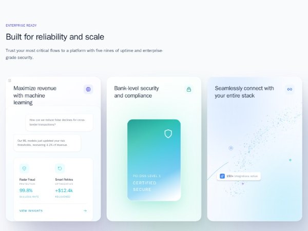 A full-width Tailwind CSS feature section showcasing enterprise reliability, security, and integrations through three animated cards with gradients, canvas effects, and hover interactions. Ideal for SaaS, fintech, or platform landing pages.