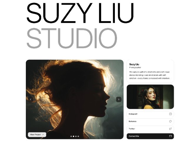 Tailwind CSS portfolio hero layout featuring a large studio heading, a 600-px tall image carousel with navigation and dots, and a sidebar holding profile, background image, and social/contact buttons. Perfect for photographer or creative studio landing pages.