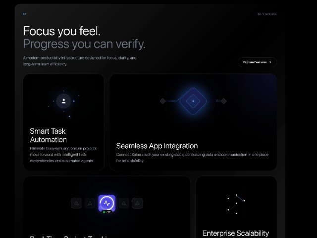 Full-width animated feature section highlighting Sakura’s benefits with headline, supporting copy, CTA button, and a responsive grid of richly animated feature cards. Built with Tailwind-style utility classes for modern SaaS marketing pages.