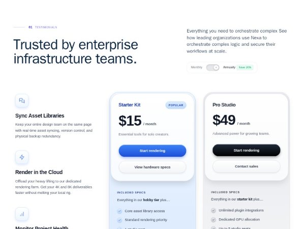 A full-width Tailwind CSS pricing section featuring a headline, intro copy, billing frequency toggle, supporting feature highlights, and two styled pricing cards. Ideal for SaaS, infrastructure, or creative platform landing pages.