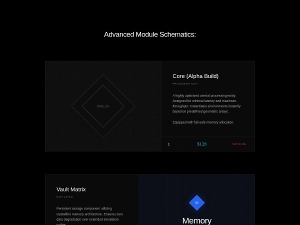 A dark, sci-fi styled Tailwind CSS feature section showcasing advanced system modules with animated visuals, specs, pricing, quantity controls, and CTA buttons. Ideal for product showcases, tech landing pages, or interactive catalog layouts.