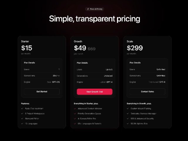 Full-width pricing section with three plans (Starter, Growth, Scale), featuring highlighted middle plan, plan details, feature lists, and call-to-action buttons. Styled with Tailwind-style utility classes for modern SaaS landing pages.