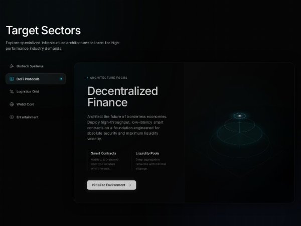 A full-screen dark Tailwind feature section showcasing industry sectors with a sidebar selector, animated content pane, CTA, and futuristic 3D data visualization. Ideal for enterprise, Web3, infrastructure, or technology landing pages.