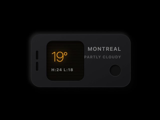 Compact weather card with neumorphic styling showing current temperature, high/low range, location, and condition icon. Uses Tailwind utility classes and gradients for a dashboard-ready, interactive, hoverable UI element.