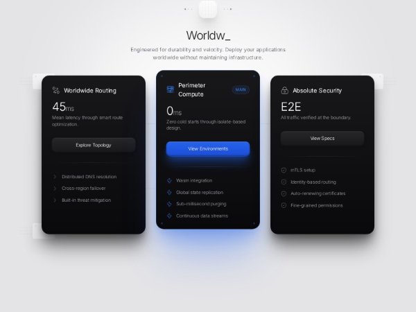 Full-width feature section with animated circuit-board background, typewriter heading, and three dark cards highlighting routing, edge compute, and security. Built with Tailwind and Iconify, ideal for showcasing technical product capabilities.