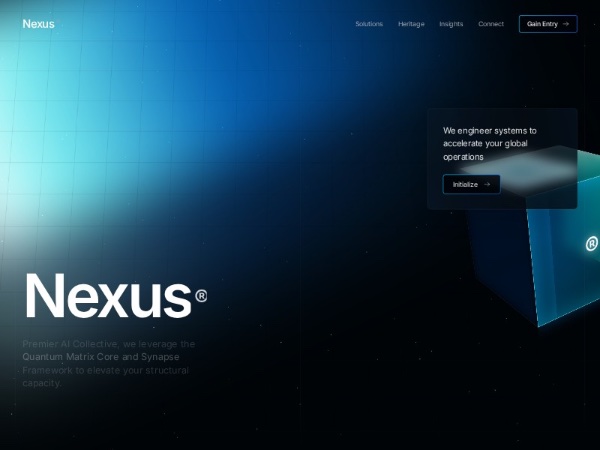 A full-screen dark hero section for an AI or enterprise tech brand featuring a glassmorphism info card, animated 3D cube, GSAP text reveals, and Three.js particle background. Built with Tailwind CSS for premium landing pages.