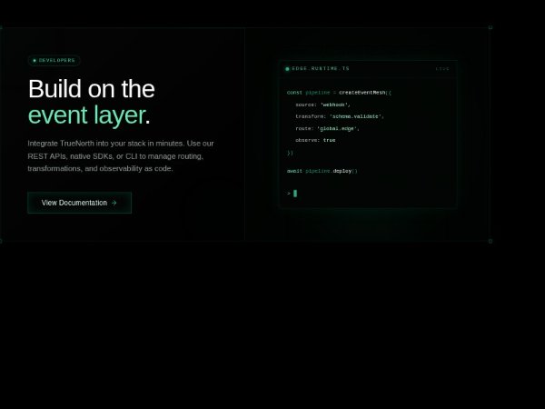 A full-width Tailwind CSS feature section promoting a developer platform, with marketing copy, CTA button, and an animated terminal-style code panel. Ideal for SaaS, API, infrastructure, or developer tooling landing pages.