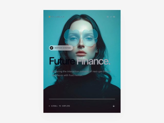 Full-screen hero slide showcasing a fintech motion concept inside a framed card. Features animated badges, bold heading, descriptive text, scroll cue, and rich ambient background using Tailwind utility classes. Ideal for landing pages or scrollable story layouts.