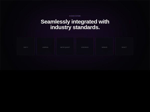 A dark-themed section showcasing platform integrations using a responsive grid of glassmorphic icons. Features reveal-on-scroll animations, purple glow effects, and interactive hover states for industrial software and web standards.