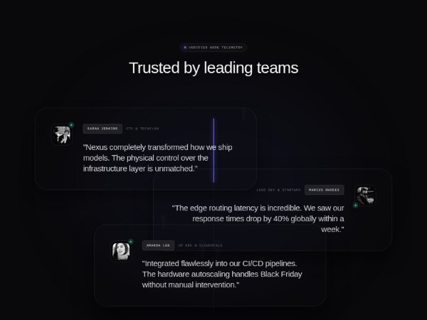 Dark, cinematic testimonial section with three floating, animated cards connected by a central line. Features avatars, roles, and quotes with holographic glassmorphism, hover gradients, and scroll animations. Ideal for showcasing customer trust on product or landing pages.