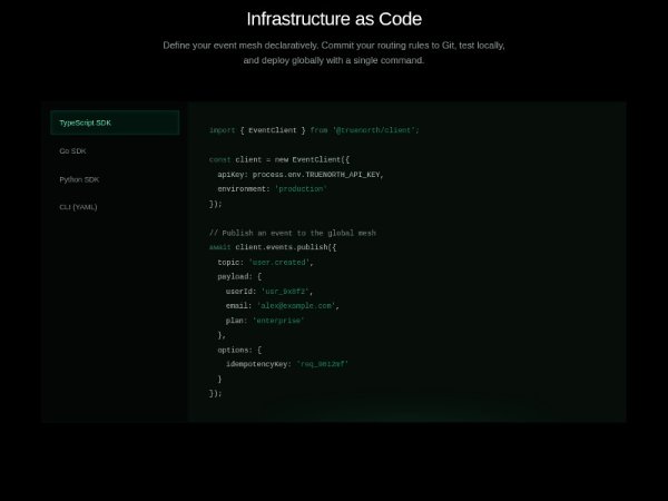 A full-width Tailwind CSS feature section showcasing infrastructure-as-code examples with interactive tabs for TypeScript, Go, Python, and CLI/YAML. Ideal for developer product landing pages, docs, and API platform marketing.