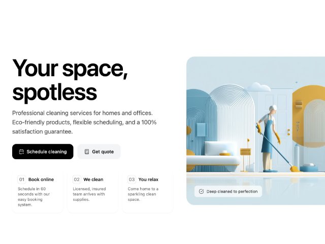 Responsive hero/banner section for a cleaning service. Features headline, subtitle, two call-to-action buttons, three-step process cards, and an image with overlay badge. Built with Tailwind CSS grid and utility classes; ideal for landing pages or service websites.