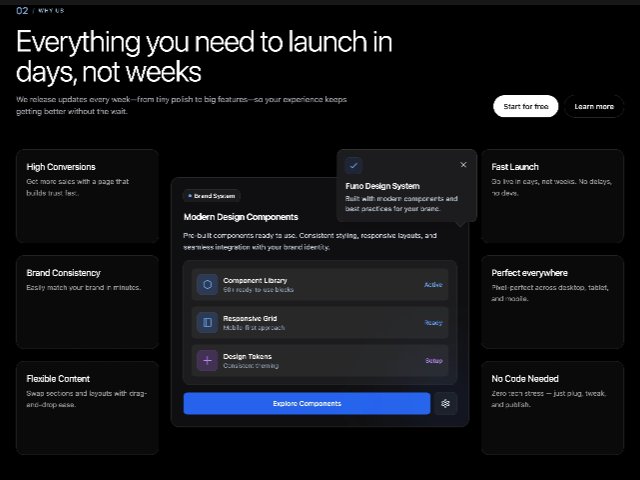 Dark-themed landing page section featuring eyebrow, headline, subtitle, dual CTAs, six feature cards and an animated central showcase card. Uses Tailwind CSS utilities, backdrop blur and scroll-triggered fade-slide animations. Perfect for SaaS “Why Us” or feature highlight pages.