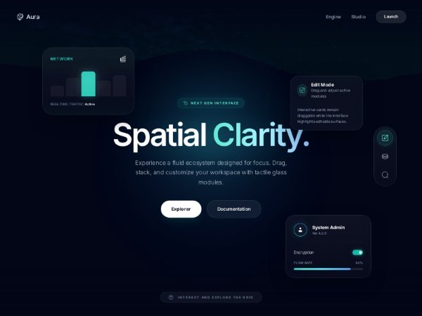 Full-screen hero section with an animated Three.js wave background, floating draggable glass panels, Tailwind styling, and CTA buttons. Ideal for futuristic SaaS, product landing pages, or concept interface showcases.