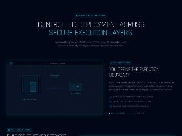A full-width Tailwind CSS feature section showcasing secure deployment architecture and operator tooling with dark cyber styling, SVG/video visuals, terminal-inspired UI, and responsive two-column layouts for SaaS, infrastructure, or platform pages.