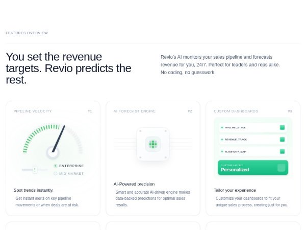 Full-width Tailwind CSS feature section showcasing AI sales forecasting capabilities with six visual feature cards, responsive grid layouts, analytics illustrations, and a supporting three-column benefits row for SaaS product marketing pages.