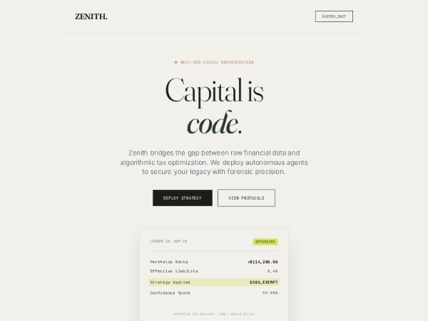 Full-height fintech hero section featuring bold typography, Tailwind-based styling, animated intro, dual CTA buttons, and a highlighted ledger-style stats card for showcasing financial optimization or tax automation products.