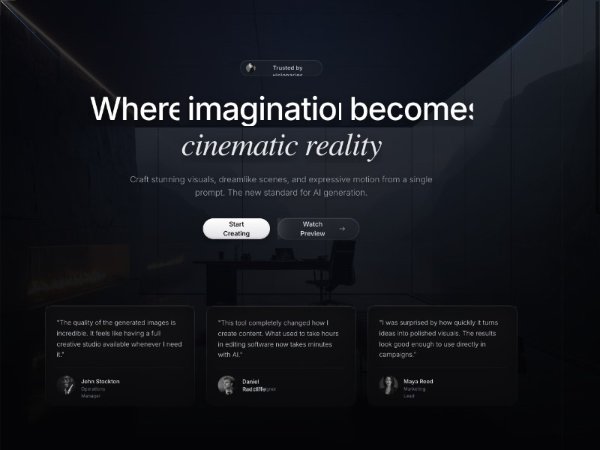 A cinematic dark-mode landing page section for an AI image and video platform, featuring an animated hero, floating testimonials, 3D-style carousel gallery, and CTA. Built with Tailwind CSS and GSAP for interactive motion-rich marketing pages.