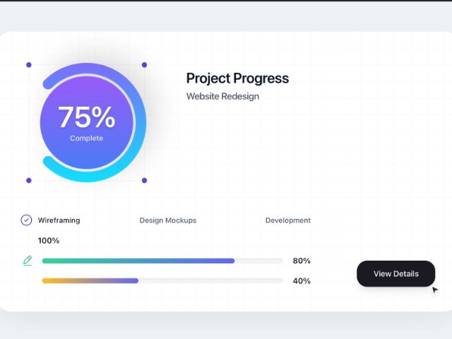 A Tailwind CSS progress card showcasing project completion with an animated circular chart, staged task bars, status indicators, and CTA button. Ideal for dashboards, project tracking interfaces, and admin UI summaries.