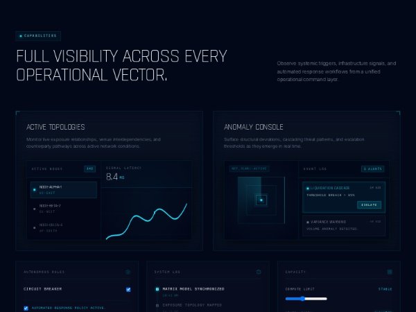 A full-width Tailwind CSS feature section showcasing operational capabilities with futuristic dashboard panels, live metrics, anomaly alerts, toggles, logs, and sliders. Ideal for SaaS, security, infrastructure, or monitoring landing pages.