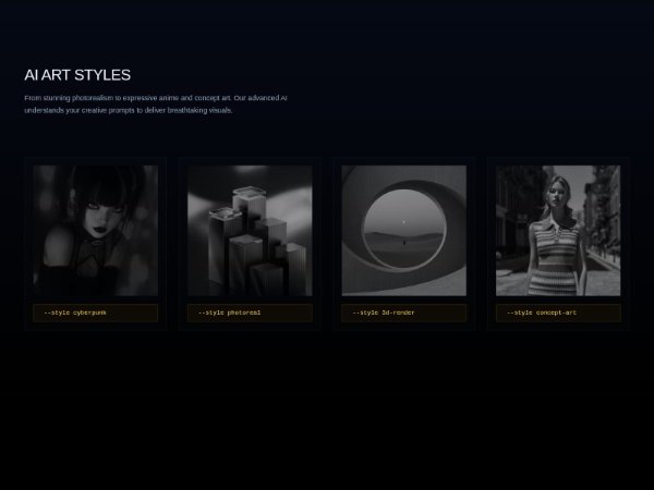 A dark-themed Tailwind CSS feature section showcasing AI-generated art styles in a responsive 4-card grid. Includes hover image effects, icon labels, and intro copy, ideal for AI art tools, creative platforms, or product landing pages.
