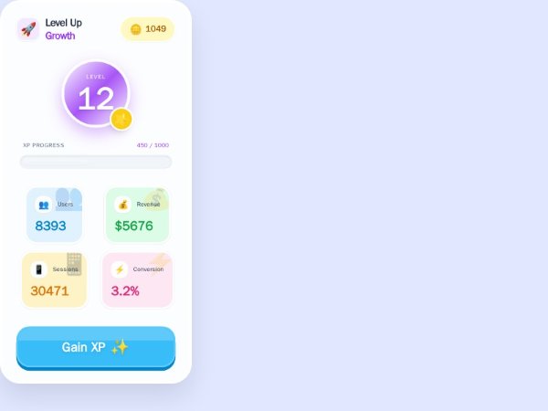 Interactive Tailwind-powered analytics card featuring animated counters, XP progress ring and bar, level badge, coins, and a 3D Gain XP button with confetti and floating coin effects. Ideal for dashboards, onboarding, or gamified growth experiences.