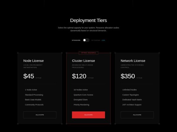 A dark-themed Tailwind CSS pricing section with three deployment plans, feature lists, highlighted recommended tier, and a billing cycle toggle. Ideal for SaaS, infrastructure, or platform pricing pages.