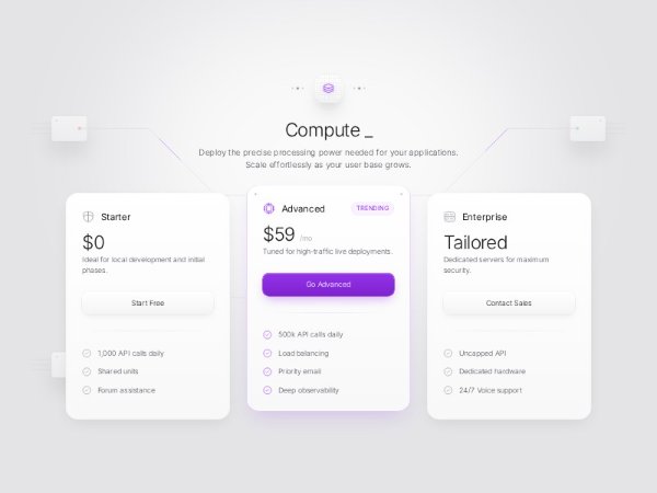 Full-width pricing section featuring three compute tiers with gradient cards, hover elevation, and CTA buttons. Includes a typewriter-animated heading and animated SVG circuit-board background. Built with Tailwind CSS, ideal for SaaS or infrastructure pricing pages.