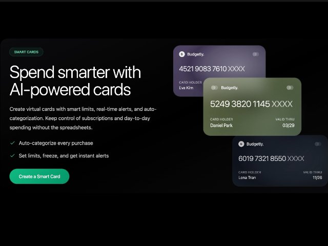Responsive hero section showcasing AI-powered virtual cards. Features headline, bullets, CTA, fade/scroll animation, stacked glassmorphism card mockups and optional Chart.js line graph. Built with Tailwind CSS, ideal for fintech landing or pricing pages.