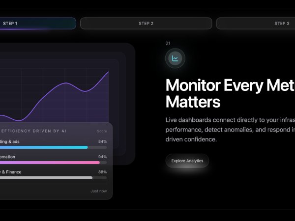 Landing page section with three-step tabs showcasing animated dashboard, progress and network visuals. Interactive buttons swap content, Chart.js renders live chart, and floating cards animate on view. Tailwind-styled, perfect for SaaS analytics or product highlights.