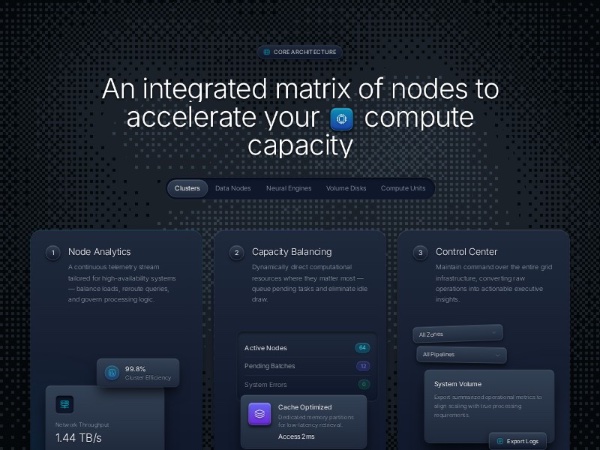 Dark-themed Tailwind feature section showcasing distributed compute infrastructure with animated headline reveals, floating metric cards, tab navigation, and a Three.js procedural WebGL background. Ideal for SaaS, cloud, AI, or platform landing pages.