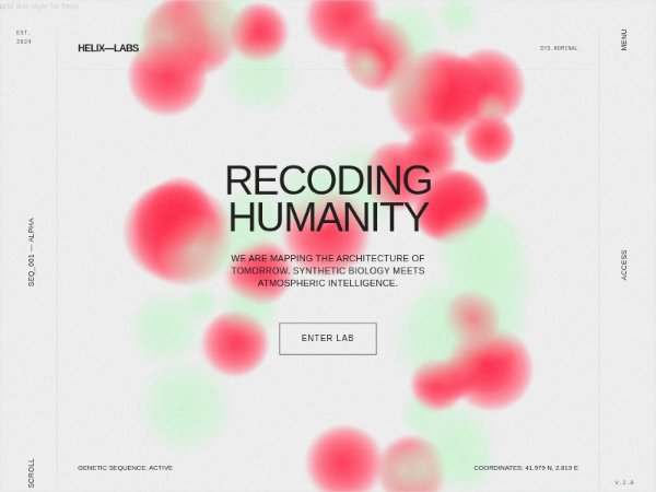 Fullscreen hero for HELIX LABS featuring a floating mission statement, animated DNA-style canvas background, grain overlay, vertical nav rails, and an interactive CTA button with headline strike-through on hover. Ideal for sci‑fi or biotech landing pages.