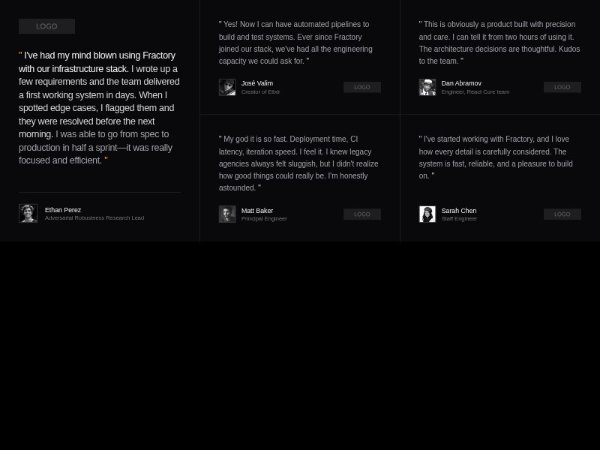 A responsive testimonial section in a multi-column grid featuring highlighted primary quote, supporting quotes, avatars, roles, and company logos. Built with Tailwind-style utility classes, ideal for landing pages and product marketing sites.