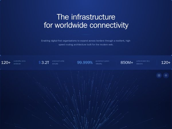 Full-screen hero section featuring a headline, animated horizontal stats ticker, and interactive canvas-based network visualization with pause control. Built with Tailwind CSS, ideal for infrastructure, SaaS, or connectivity-focused landing pages.