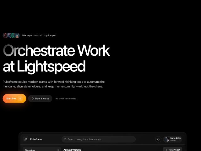 Full-width SaaS hero section featuring social proof avatars, headline, supporting copy, dual call-to-action buttons, and a rich dashboard-style preview card showing projects and activity. Styled with Tailwind-style utility classes for modern, responsive landing pages.