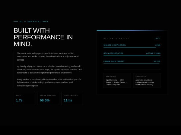 A dark, futuristic feature section highlighting system architecture and performance metrics with telemetry bars, benchmark stats, and scroll-reveal animations. Built with Tailwind CSS for responsive product, SaaS, or tech landing pages.