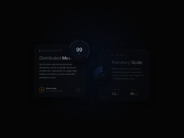 A full-screen Tailwind CSS feature section showcasing two animated glassmorphism dashboard cards for distributed mesh and telemetry metrics. Uses GSAP, SVG progress/radar visuals, and Iconify icons for futuristic SaaS, infrastructure, or data platform landing pages.