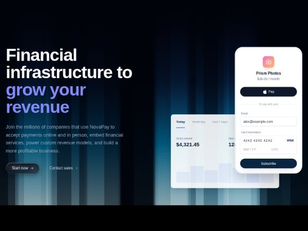 A dark Tailwind CSS hero section for a fintech or SaaS landing page, featuring animated canvas aura effects, strong marketing copy, CTA buttons, and layered payment/dashboard mockups to showcase product capabilities.