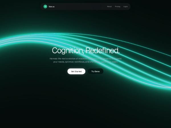 Dark-themed landing hero for an AI product featuring a pill navigation bar, headline, CTA buttons, and a custom animated WebGL wisp background. Built with Tailwind CSS, ideal for SaaS, startup, or product launch landing pages.