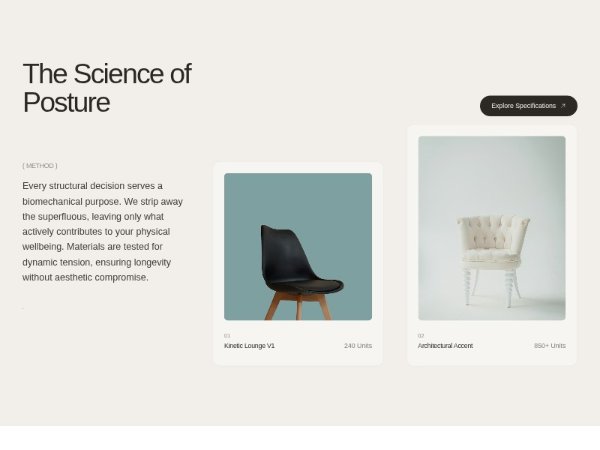 A full-width feature section showcasing posture-focused furniture with descriptive copy and two interactive WebGL image cards featuring flashlight hover, staggered layout, and animated sonar accent. Built with Tailwind utility classes and custom JS for WebGL reveal.