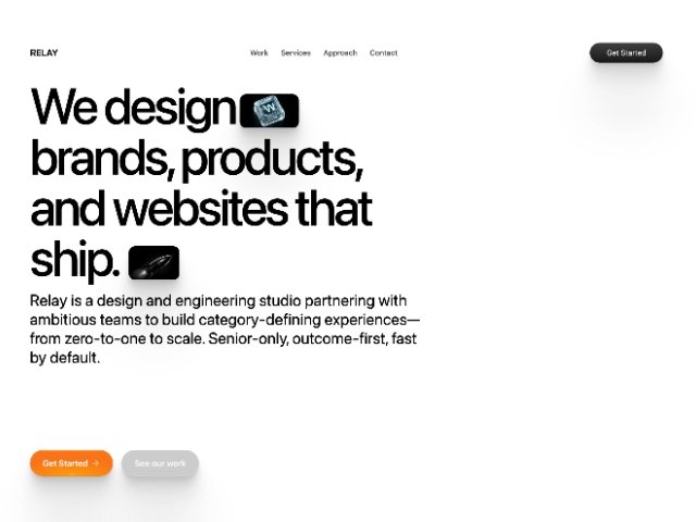 Full-width hero section featuring logo, responsive navigation, Playfair headline with inline images, feature badges, and two call-to-actions—one is a gradient button with floating points animation. Styled with Tailwind utilities for modern agency or product landing pages.