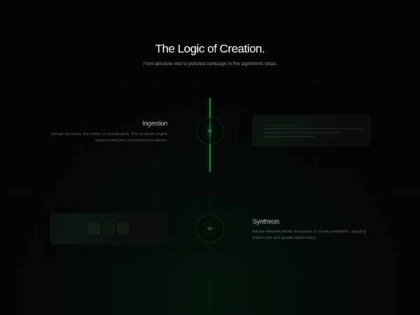 A dark, full-width feature section visualizing a five-step creative workflow with alternating timeline cards, glowing nodes, and scroll-triggered animations. Built with Tailwind-style utility classes, custom CSS, and IntersectionObserver for product or AI platform storytelling.