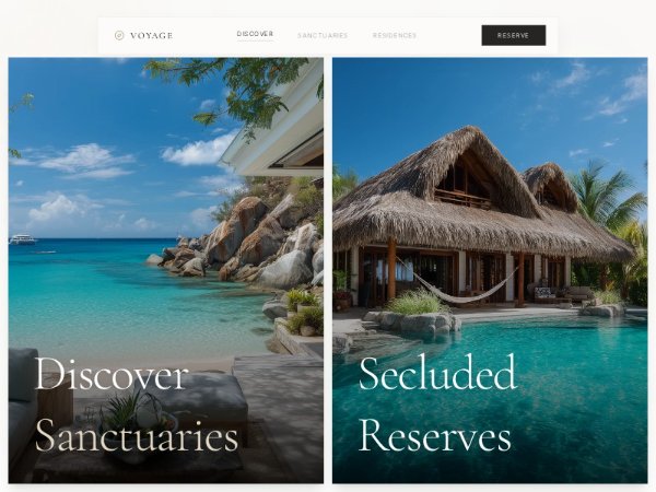 A full-width luxury travel hero with split-screen destination panels, floating navigation, animated text reveals, hover zoom effects, and GSAP-powered entrance transitions. Built with Tailwind CSS, suitable for premium resort, hotel, or travel landing pages.