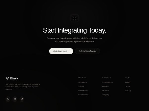 Full-width dark footer section featuring a prominent CTA with dual buttons, brand area, social icons, multi-column navigation links, and animated reveal effects. Styled with Tailwind-like utility classes and ambient glow backgrounds for SaaS or AI product sites.