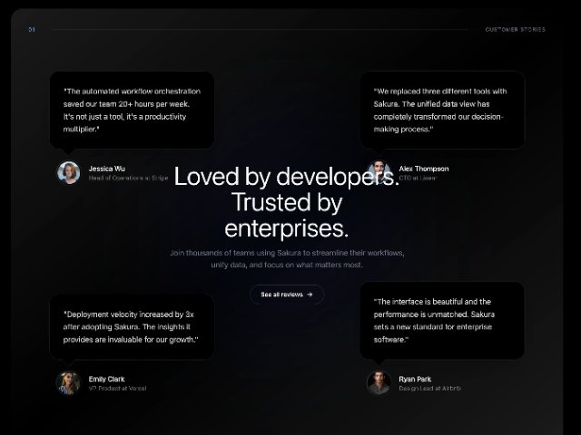 Full-width animated testimonials section featuring rotating customer quotes around a central heading and CTA. Uses Tailwind-style utility classes, gradient background, and JS-driven card content updates. Ideal for SaaS or enterprise landing pages.