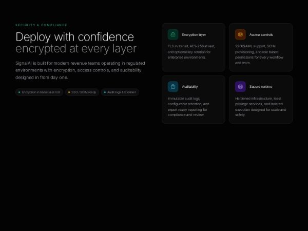 A dark-themed Tailwind CSS feature section showcasing security and compliance capabilities with a headline, trust badges, and four icon-based cards for encryption, access control, auditability, and secure runtime. Ideal for SaaS landing pages.